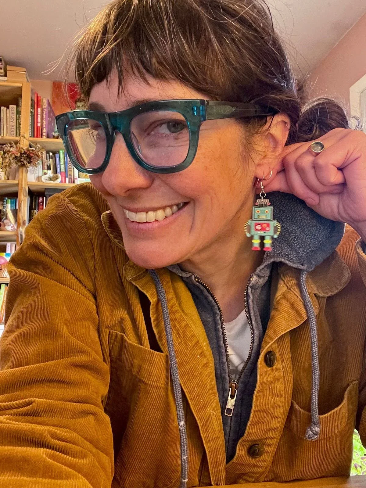 Picture of me borrowing my kiddo's Robot earrings for our Grove Community workshop on the illusion of constant growth.